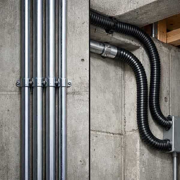 در برخی پروژه های مسکونی سبک، برق کشی داخلی واحدها یا فضاهای خشک و کم ریسک، استفاده از لوله فولادی الزامی نیست. در این شرایط، لوله های PVC یا خرطومی های استاندارد می توانند پاسخگوی نیاز باشند و هزینه اجرا را کاهش دهند. به طور کلی، زمانی که خطر ضربه، رطوبت شدید یا شرایط صنعتی وجود ندارد، انتخاب گزینه های سبک تر و اقتصادی تر منطقی تر خواهد بود.