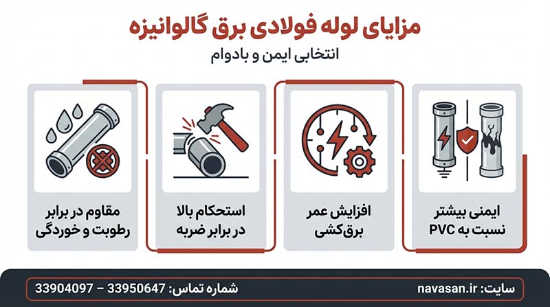 لوله فولادی گالوانیزه یکی از مطمئن ترین انتخاب ها برای اجرای اصولی و ایمن برق کشی است. ترکیب استحکام فولاد با پوشش محافظ روی، باعث شده این نوع لوله در پروژه های ساختمانی و صنعتی نسبت به لوله های PVC یا پلاستیکی برتری قابل توجهی داشته باشد. مقاومت بالا، طول عمر بیشتر و کاهش ریسک آسیب به کابل ها، مهم ترین دلایلی هستند که استفاده از لوله فولادی را به یک انتخاب حرفه ای تبدیل می کنند.